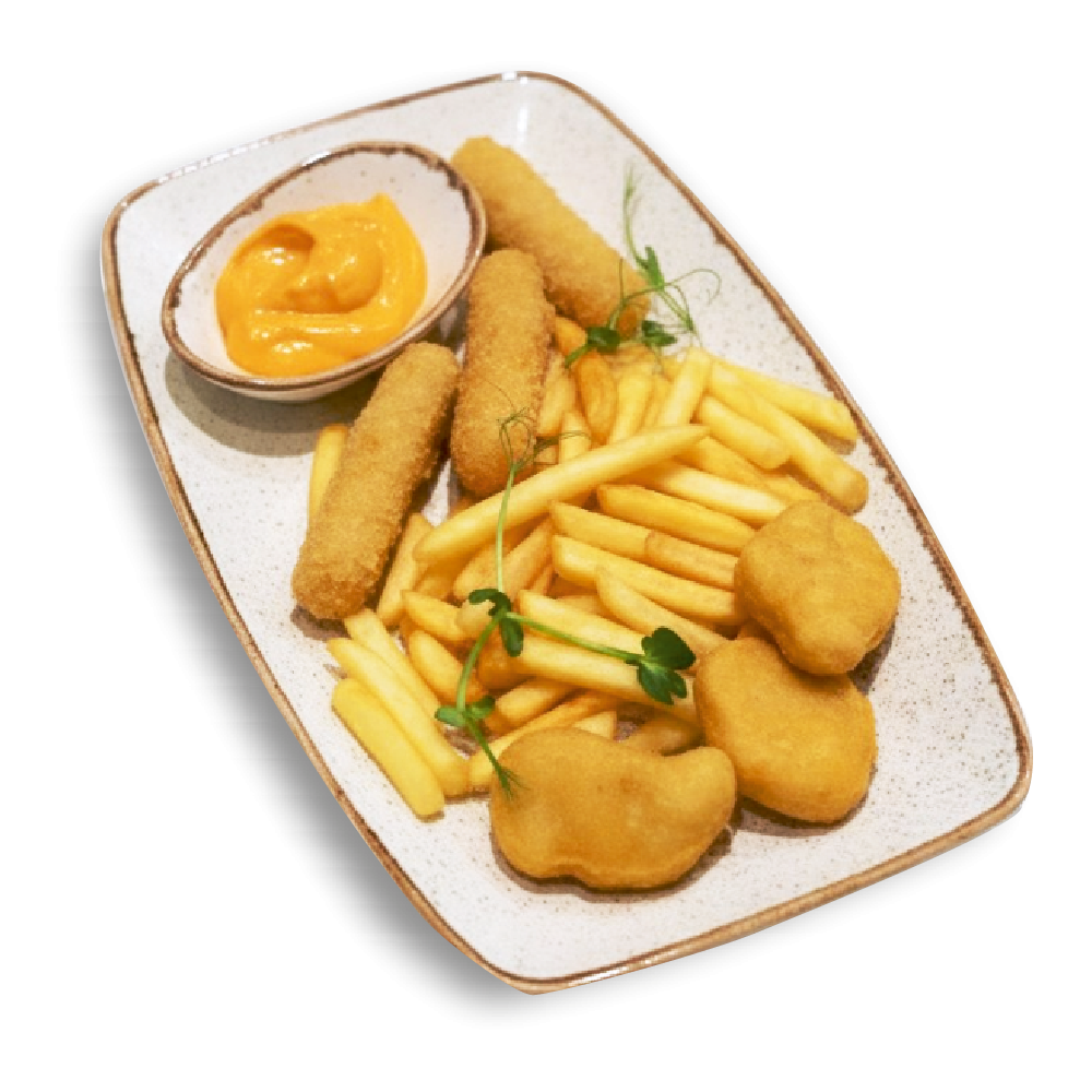 Наггетсы, сырные палочки, картошка фри - 250 грамм и соус бургерный - 50 грамм